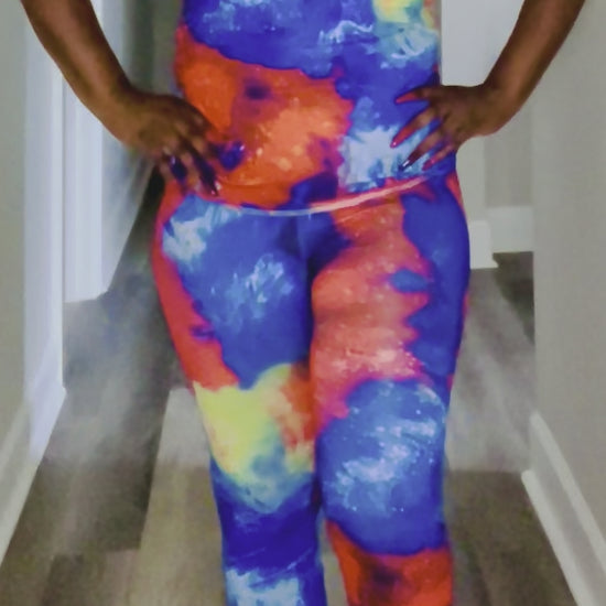 Colorful tie-dye, short-sleeved T-shirt tights and trouser suits.